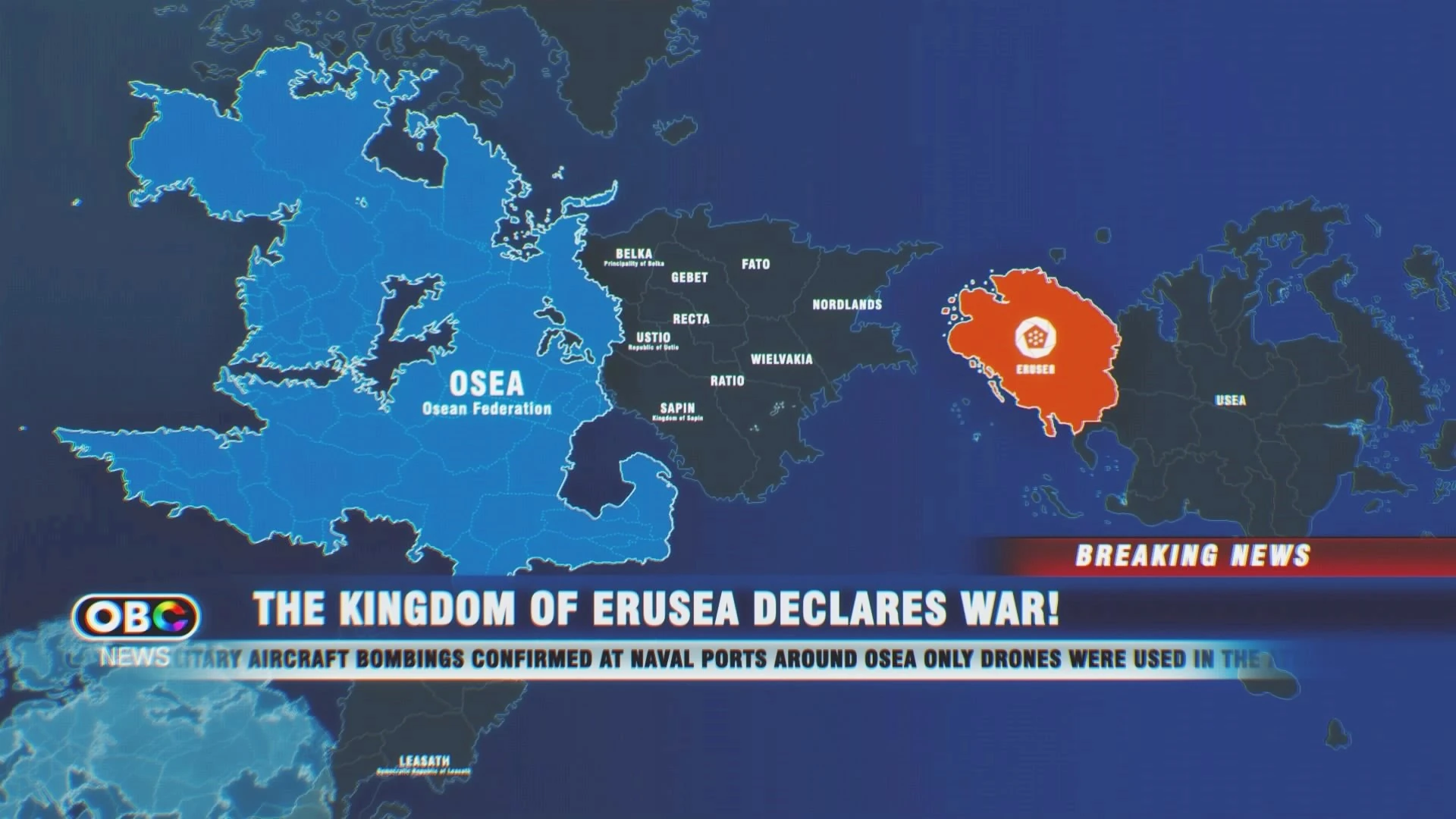 В мае 2019 года Эрусея объявила войну Осеи и захватила космический лифт вскоре после того, как эрусейские беспилотники MQ-99, скрытно доставленные в контейнерах на торговых судах, атаковали осейские порты и стоявшие там авианосцы, выведя их строя. Одновременно с этим эрусейские бомбардировщики атаковали базы МООН и Осеи по всему континенту Усея, вплоть до восточной базы на острове Форт-Грэйс.