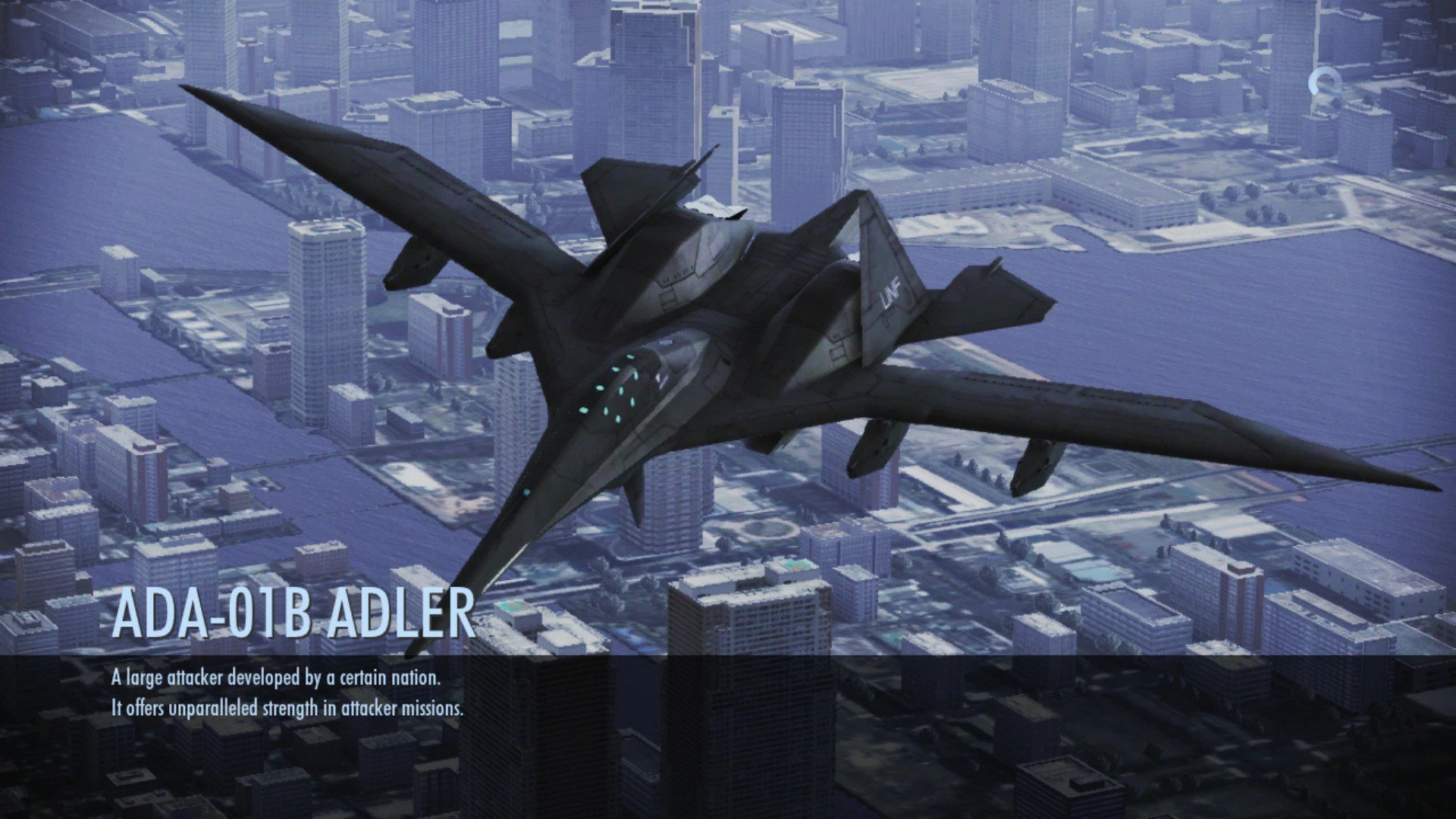 The ADA-01B ADLER (アドラー/Adorā) is an attacker variant of the ADF-01 FALKEN, designed to defend it from surface-to-air attacks. It is the B model in the ADA-01 line of aircraft, and replaces the SDBM from the ADA-01A with the MPBM.