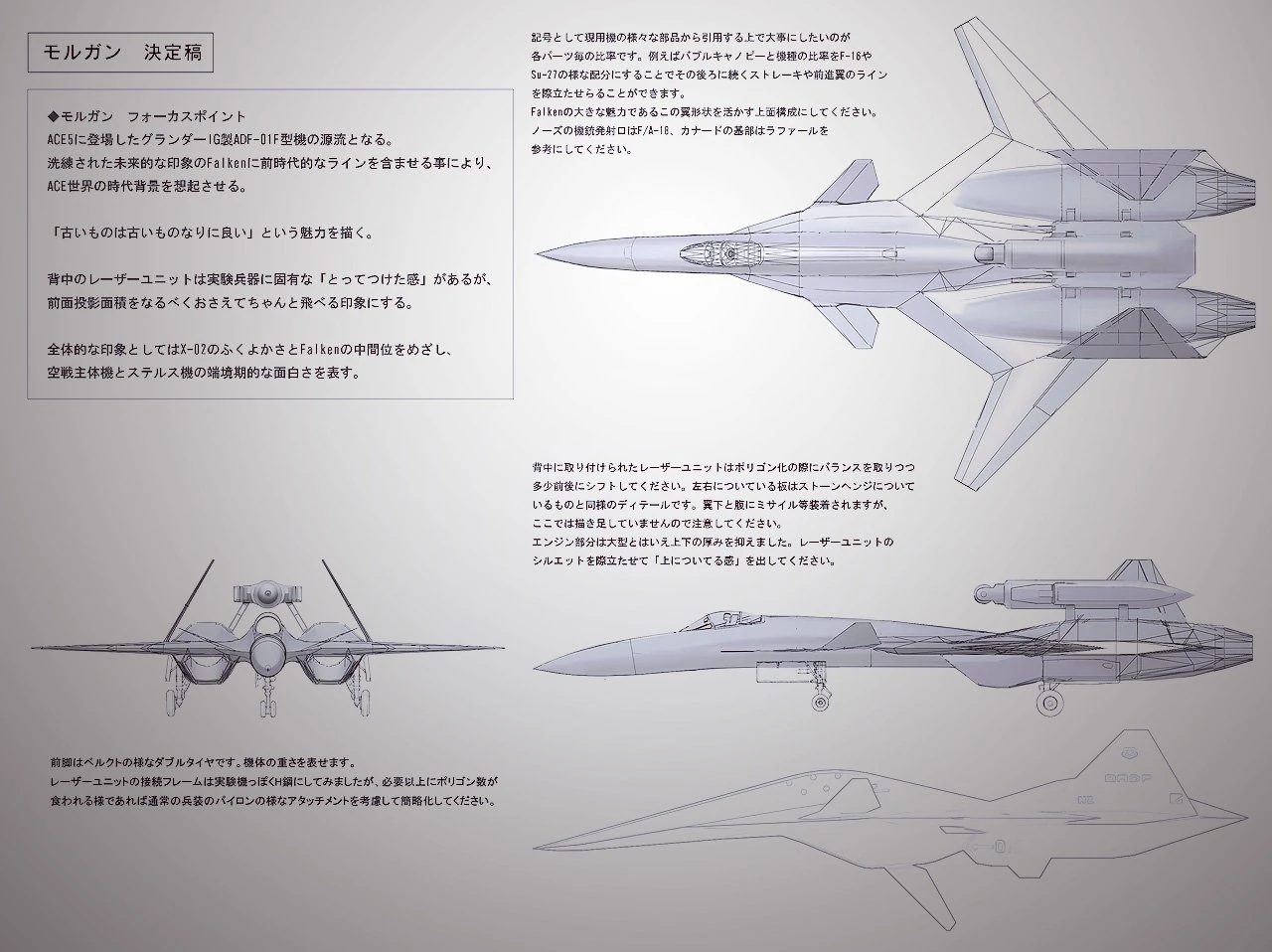 - "A prototype fighter created by the UN Forces based on plans from an unspecified country. It is classified as a supreme aircraft within the 4.5th generation of fighter aircraft and can be equipped with powerful weapons such as the "TLS" (Tactical Laser System) and "MPBM" (Multi-Purpose Burst Missiles). It features forward-swept wings and canards resulting in high maneuverability despite its size as a large scale aircraft. However, during the golden age of stealth aircraft, the ADFX-01 Morgan failed to prove its worth and has remained a prototype ever since. Its codename is "Morgan," a reference to a fairy from the King Arthur legends."