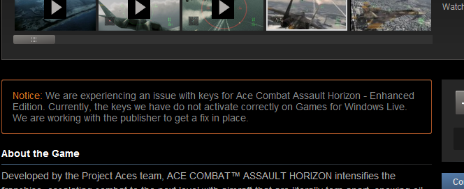 Starting on the week of November 24, 2013, people who purchased Ace Combat: Assault Horizon Enhanced Edition were given invalid GFWL keys that did not redeem for Assault Horizon Enhanced Edition, or anything at all.[7] In response, on December 2, 2013, Steam shut down future purchases of the game while they worked out the problem with Namco Bandai Games and Microsoft. As of February 24, 2014, the game could still not be purchased; however, some players were given refunds (in the form of Steam credit).[7] On February 24, Tony Shoupinou confirmed that the game was going to be available for sale again once the Steamworks transition was ensured to be running smoothly.[8]