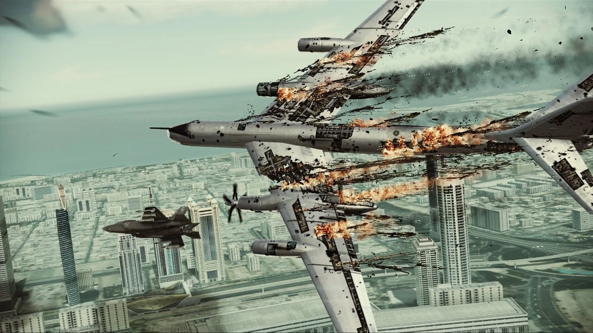 The game runs on a revamped game engine allowing for destruction on a scale never seen before in Ace Combat, and indeed in a flight simulator. This engine allows for real-time deformation: as an example, sustained gunfire on an enemy fighter will rip off its tail, while more severe damage will either tear off the wings or (in more extreme cases) even completely disintegrate the airframe as a whole, spilling the aircraft's oil across the sky and forcefully ejecting the pilot from the cockpit. As mentioned before, buildings and other structures are now subject to combat damage and will deform in real time. Scenery damage will be often combined with Close Range Assault to provide a cinematic feel to gameplay—for example, stray fire in a pursuit will hit nearby buildings, forcing the player to evade the debris while remaining in pursuit. However, this is only at scripted points in the campaign.