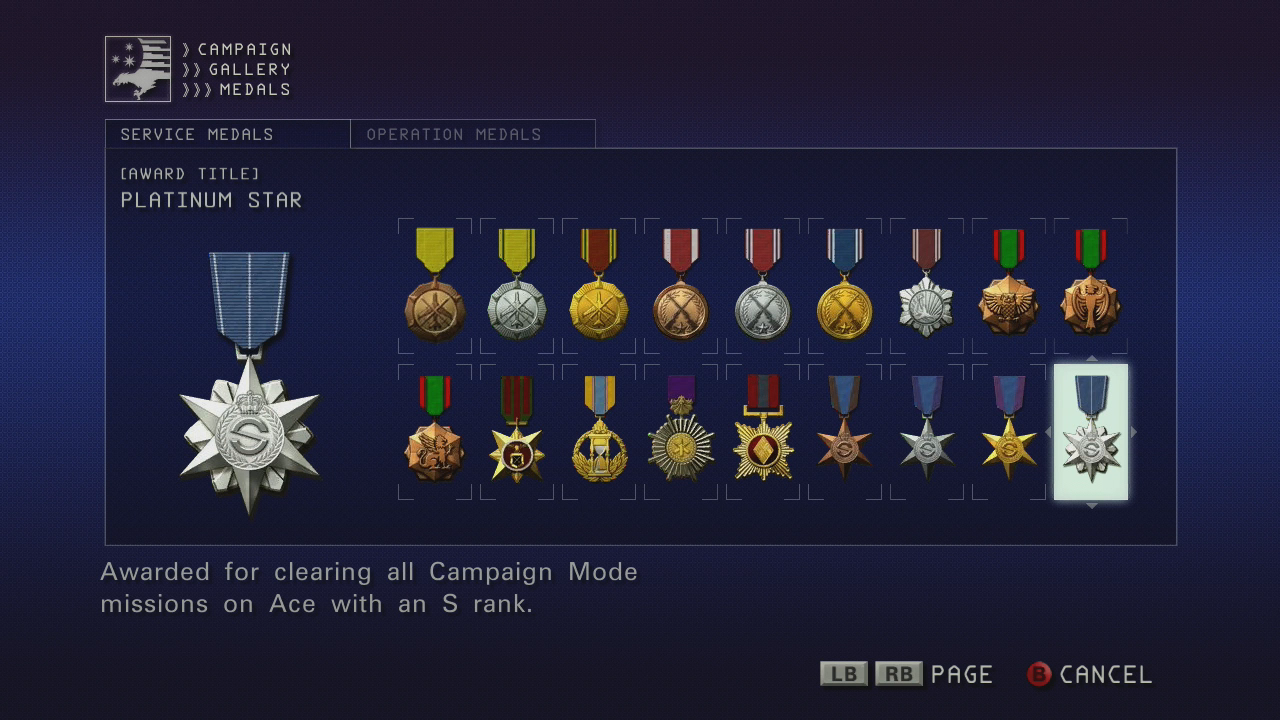 Following is a list of service medals in Ace Combat 6: Fires of Liberation. There is a total of 18 Service Medals to collect in the single-player campaign mode. Free Mission can also be used to earn these medals unless otherwise stated. There are also 35 Operation Medals not listed below that are unlocked for completing each operation within each mission.