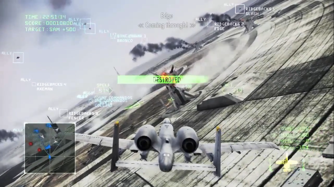 - The head-up display shows the traditional radar and aircraft info (ammo, health, reloading) along the bottom of the screen; allotted score, remaining time, and the score of the targeted enemy are located on the top-left of the screen; and any checkpoints are noted in the top-right of the screen as they are encountered.