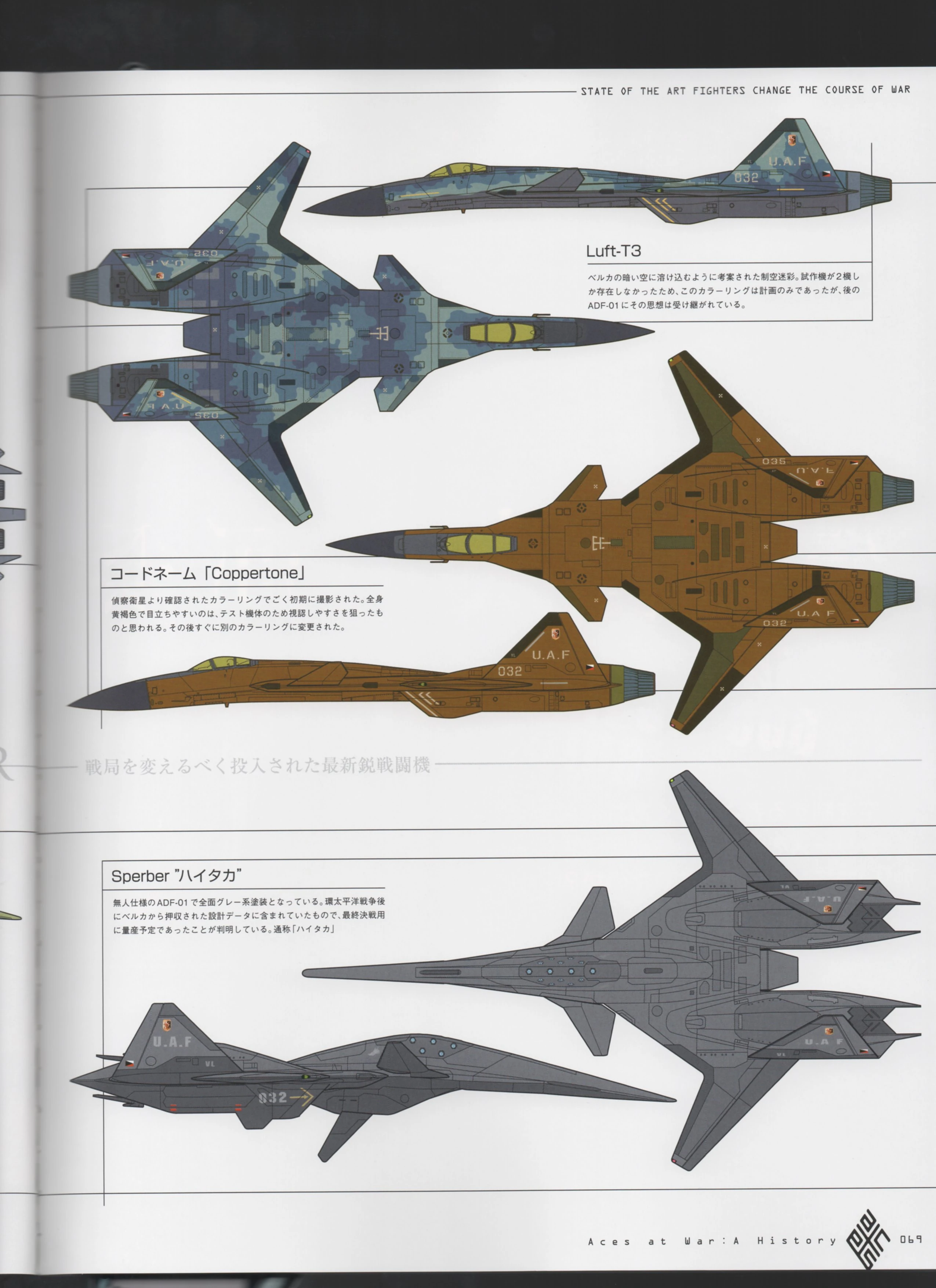 - State of the Art Fighters Change the Course of War - showcases of the ADFX-01 Morgan, ADF-01 FALKEN, and X-02 Wyvern, the main fictional aircraft of the three PlayStation 2 games