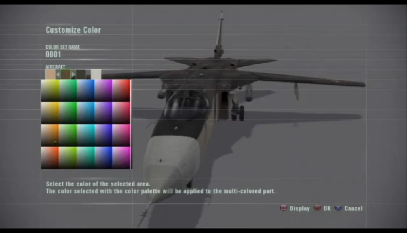 Color Customization is a new feature introduced in Ace Combat: Assault Horizon. As its name states, it allows players to fit their planes with personalized paint schemes. Different parts of the player's aircraft can be customized with different colors, although emblems cannot be customized by any means.