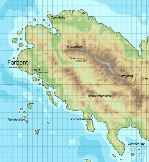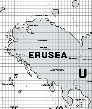 Erusea's capital city, Farbanti, is partially constructed by man-made landfills.[26] Its westernmost district was flooded by the Ulysses meteorite that created Ryker Crater.[20] Erusea's territory also includes Cape Rainy to the north, the strategic port city Anchorhead to the south, and the Twinkle Islands south of Farbanti.