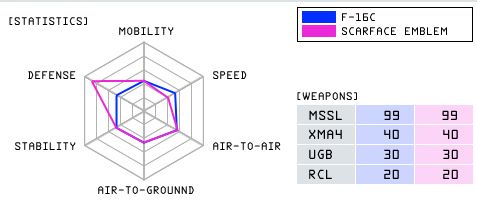 The first available variant of the F-16C Fighting Falcon, the Scarface Emblem is themed on Scarface Squadron, the protagonist's squadron in Ace Combat 2. In appearance, it is a basic Emmerian Falcon with Scarface markings. The tailcode has been changed to "PE 097".