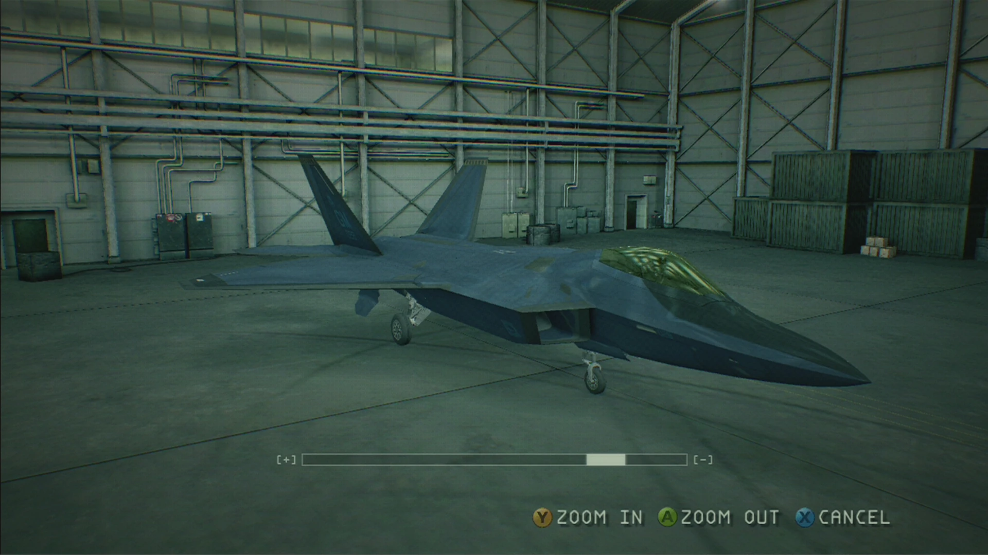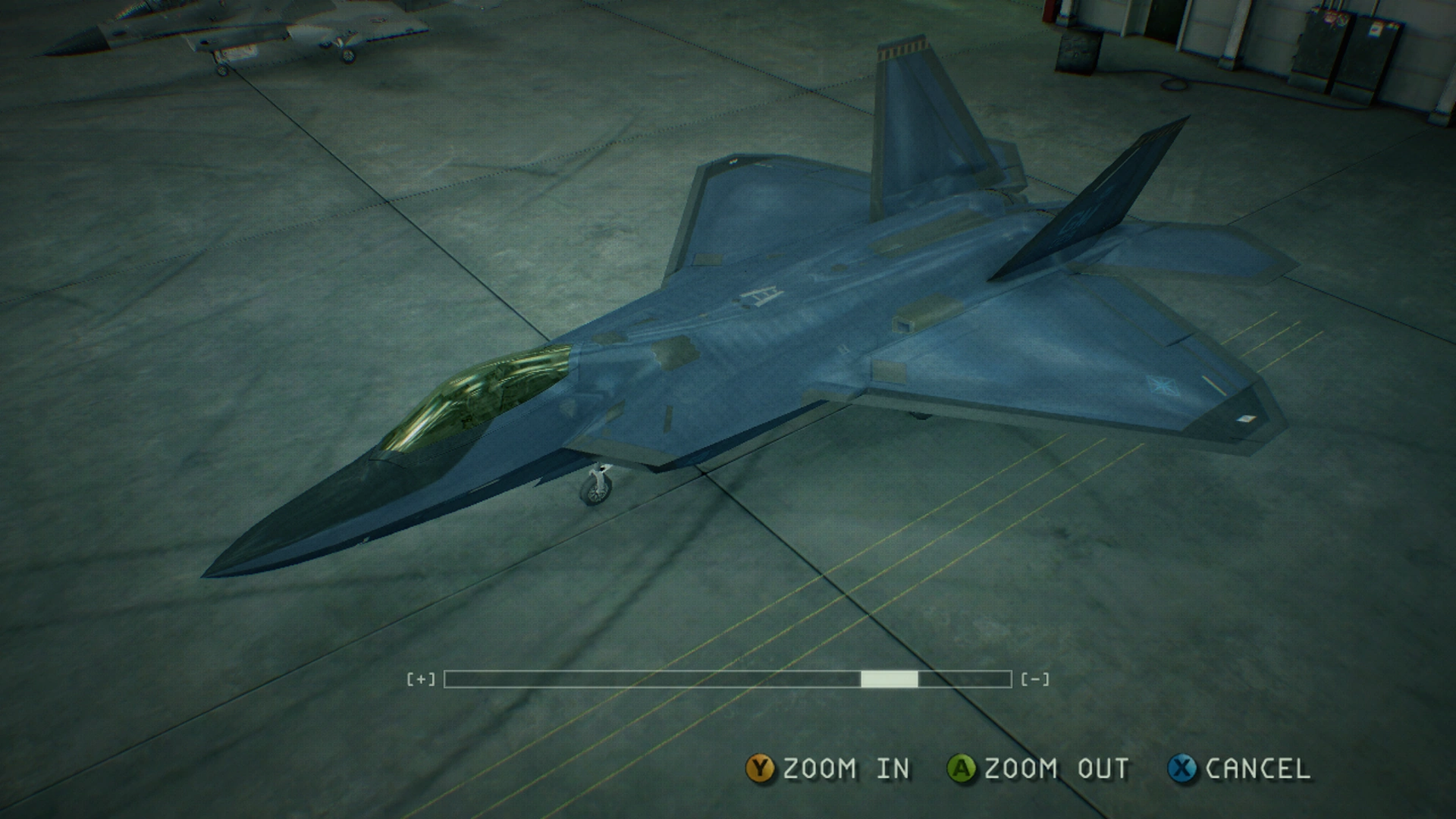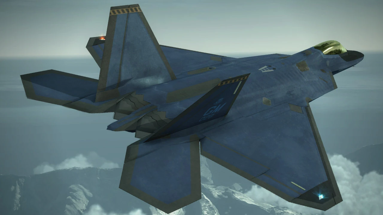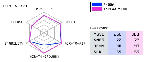 Like the rest of the aircraft in the Colored Wing lineup, this F-22 is one meant for airshow use, and is given a special color. The aircraft is colored indigo all around, save for the nose, some letters and outlines of the aircraft, which are black. The stats of the aircraft remain unchanged, save for the Air-to-Air and Air-to-Ground stats which are maxed out. This makes it more potent as a multirole aircraft and makes using the SOD pod more effective to use. Also, the missile trails are colored indigo to reflect the aircraft skin, and received a massive standard missile ammo increase to 800. It is considered the better of the F-22 DLC choices because of this.
