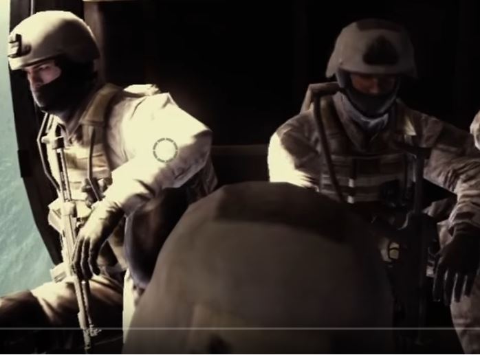 Two Navy SEAL operatives are shown wielding MP5s with retractable stocks in Nomad 61s passenger cabin before the start of a joint operation to interdict SRN cargo ships that were suspected of carrying Trinity weapons.[22]