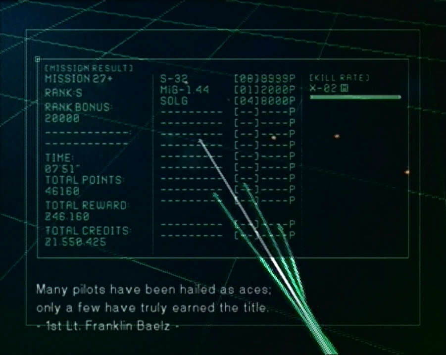 First Lieutenant Franklin Baelz is a character mentioned only once in Ace Combat 5: The Unsung War. If the player earns an S rank on all 32 missions on Ace difficulty, a quote from Franklin Baelz will appear in the debriefing of the final mission the player earns the S rank in.[1]