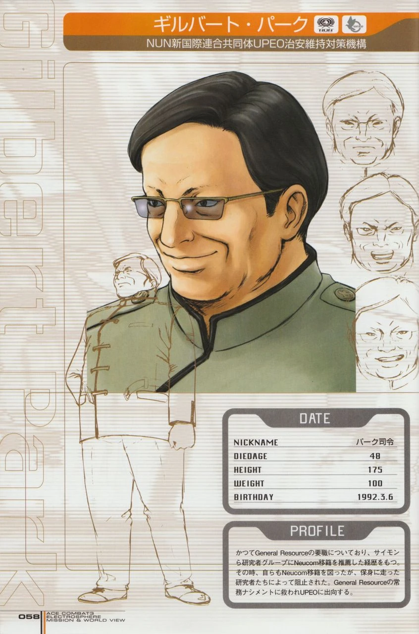Gilbert Park (ギルバート・パーク Girubāto Pāku)[1] is the commander of the Universal Peace Enforcement Organization's Special Armed Response Force.