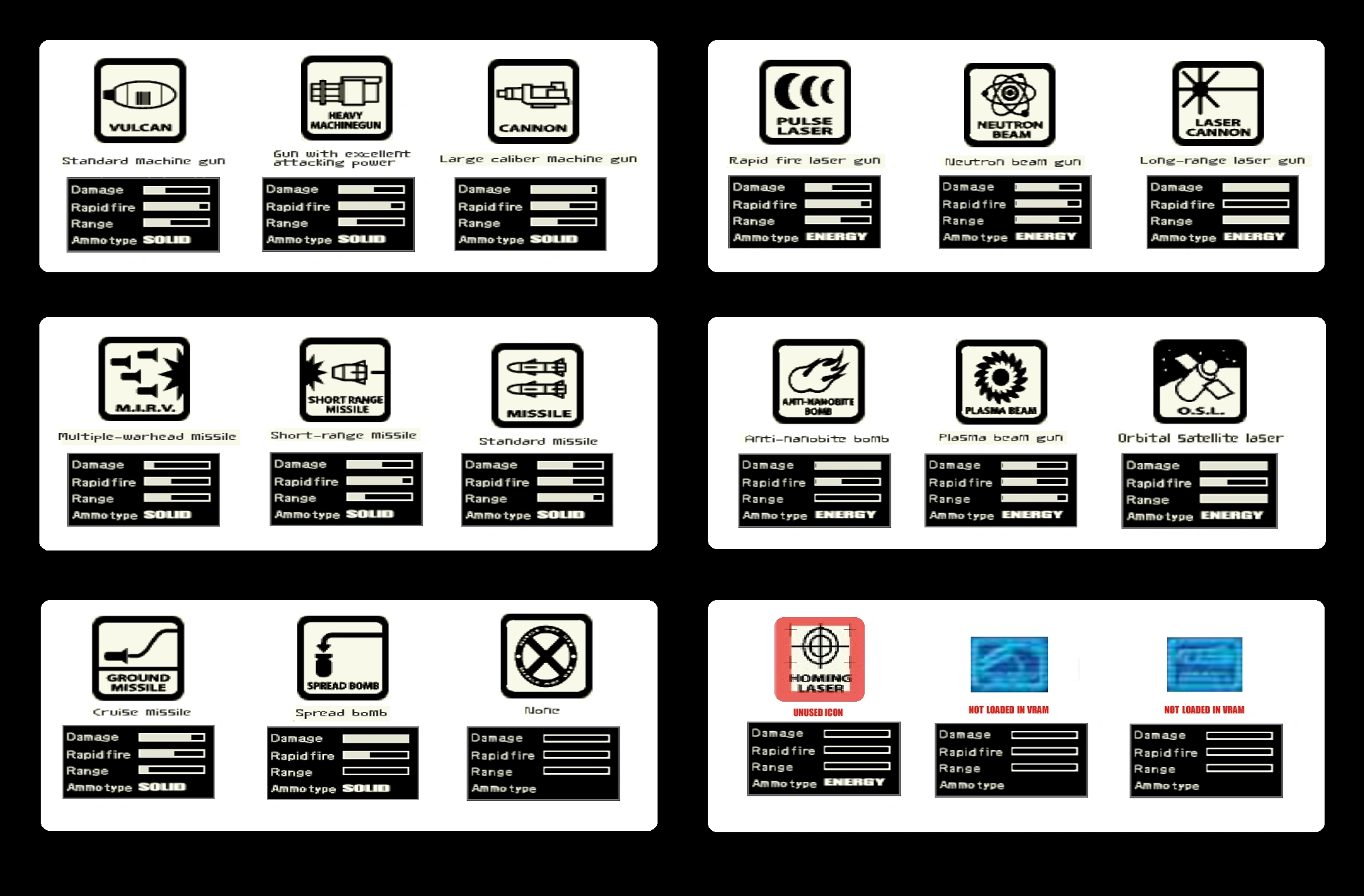 | TLS | Tactical Laser System | Fires a devastating laser beam in a straight line and can instantly destroy any air and ground target on all range | Similar systems were incorporated into the Belkan Excalibur in 1995 and Osean Arkbird in 2010. Weakened for ACI. |