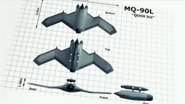 - ↑ Description of the aircraft on File:MQ-90 Quox Development Blueprint.jpg.
