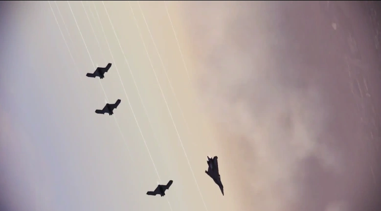 An Su-35 flying among MQ-90Ls