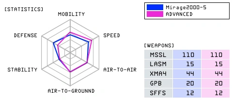 The Mirage 2000-5 Advanced possesses superior speed and mobility over the original model, at the expense of lighter armor. The aircraft has the tendency to "High-G lock"; that is, remaining locked in a High-G turn. Weapons capacity and performance are unaffected.