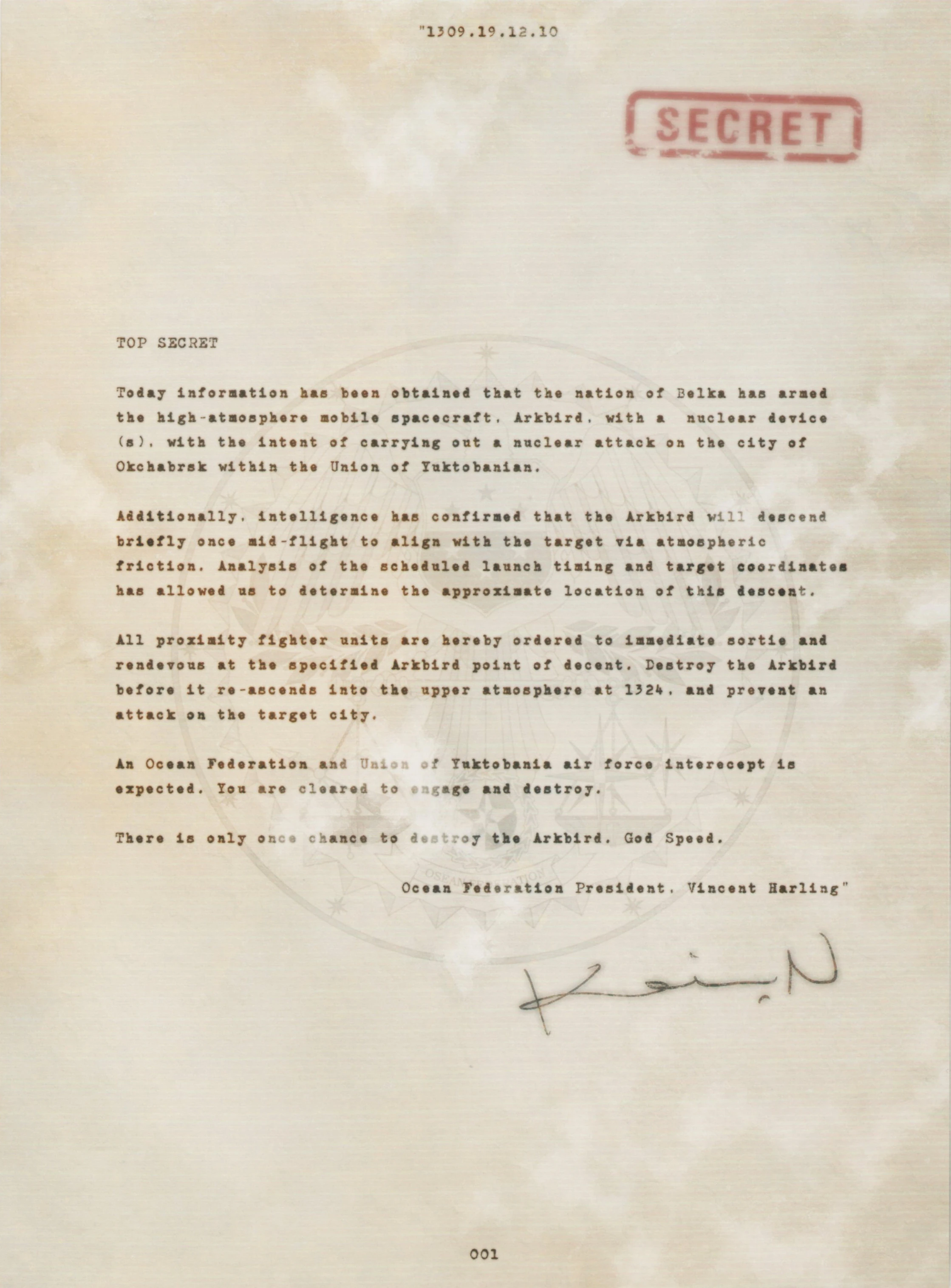 Osean President Vincent Harling, who was on board the OFS Kestrel and leading the Razgriz's operations at the time, had to authorize the plan before Razgriz could attack. At 13:09, a few minutes before Razgriz made contact with the Arkbird, Harling wrote and signed a document authorizing the squadron to use all necessary force to prevent the attack.[3] The text of the letter is below:
