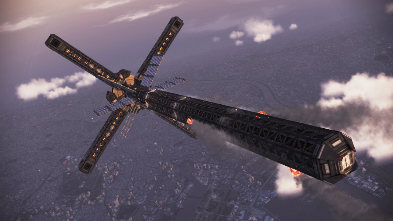 Satellite Interception IV plays very similarly to Satellite Interception I, Satellite Interception II, and Satellite Interception III. Players spawn above Tokyo Bay, each team on each side of the radar, as SOLG -Gould- begins to fall towards the city. Four sets of targets must be destroyed, starting with Gould's Solar Array Wings (SAWs) and exterior MAG panels. The SAWs will be very resilient, more so than previous versions of the mission, but the MAG panels will be easy to destroy as always. All of these will fly backwards towards the players when they break off after being destroyed, and a large and damaging fire will begin at the front of the satellite after some SAWs are destroyed, so players must exercise caution to not get physically damaged.