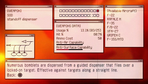 The Stand-off Dispenser (SOD) is a special weapon of the Ace Combat series. Numerous bomblets are dispersed from a guided dispenser that flies over a locked-on target. Effective against targets along a straight line. Stand-off Dispenser are cruise missiles or glide bombs which may be launched at a distance sufficient to allow attacking personnel to evade defensive fire from the target area. Typically, they are used against land and sea-based targets in an offensive operation. The name is derived from their ability to engage the target while standing off outside the range at which the defenders are likely to engage the attacker. In all games, the AGM-154 JSOW provides the model for the weapon.