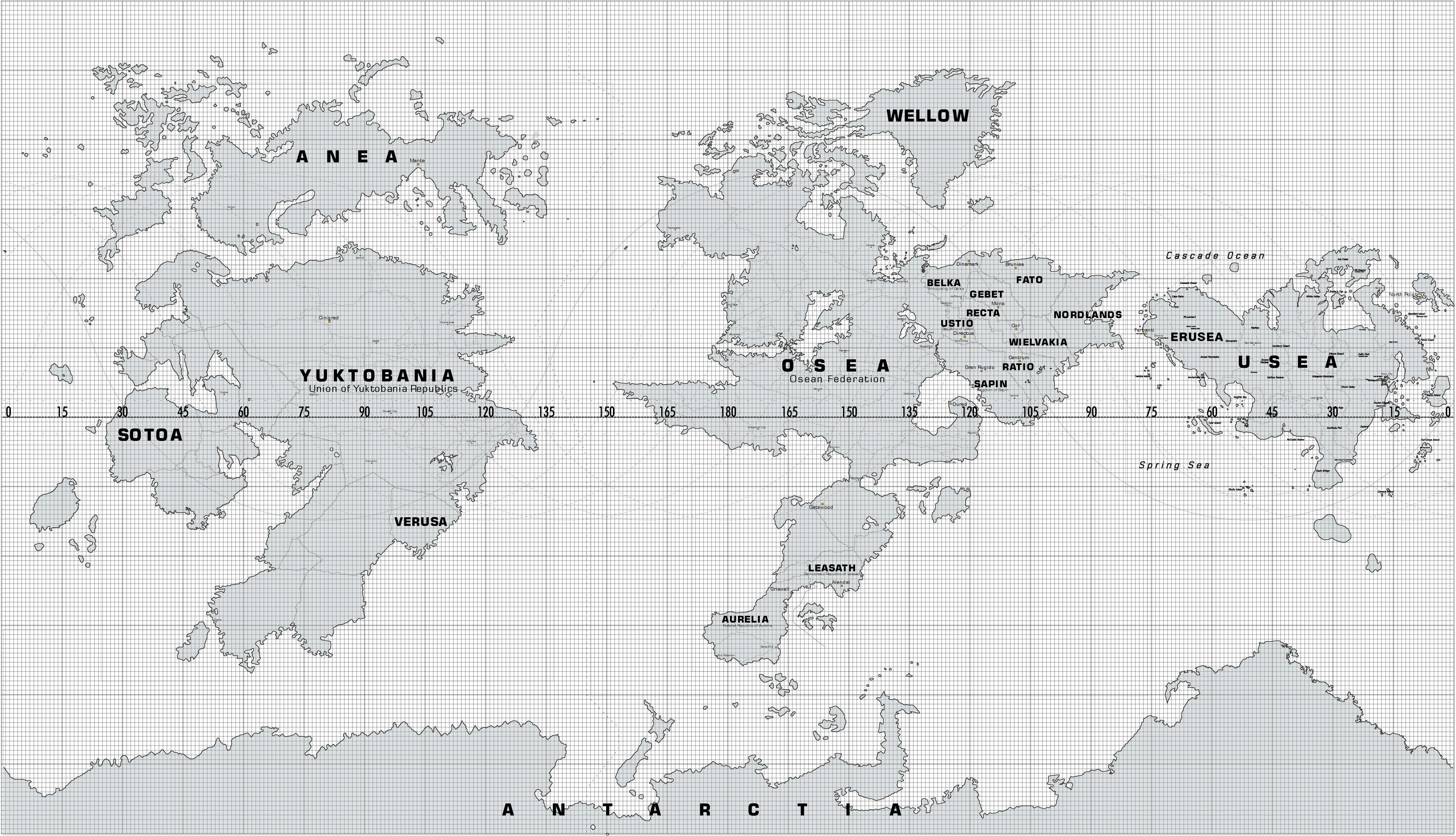 The Osean continent is one of the largest continents on the planet and is home to a large number of people. Numerous conflicts have been fought here, outnumbering the known conflicts on any other continent. The continent is separated into at least a dozen countries. The known countries and their position on the Osean continent are as follows: