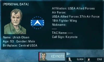 Ulrich Olsen was the commander of Scarface Squadron and served as the squadron's AWACS operator during the Usean coup d'état in 1998. In battle, he used the callsign "Keynote", though Slash would typically refer to him as "Pops".