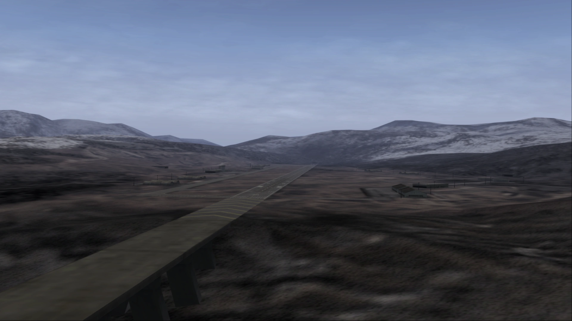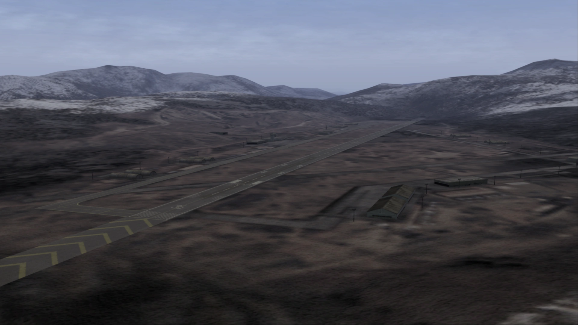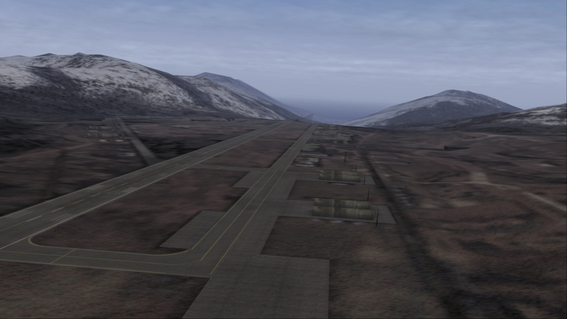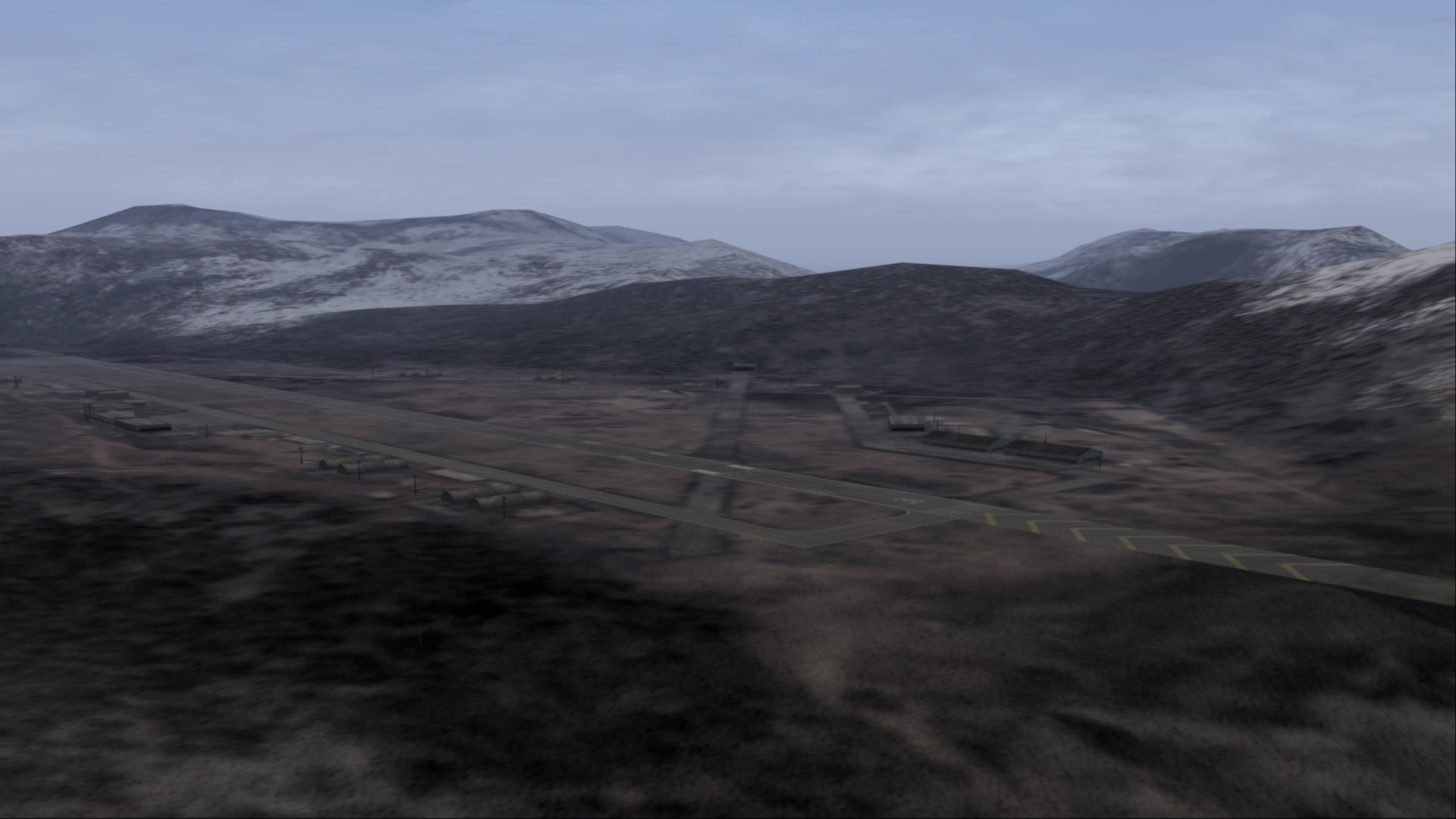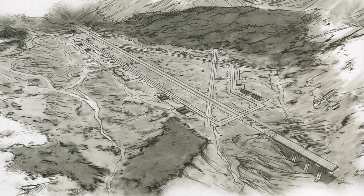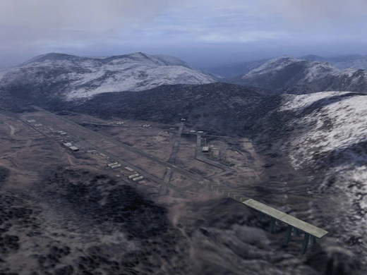 Valais Air Base is situated atop a flat stretch of land within one of the Tyrann Mountains' rocky, glacial valleys. Due to the area's wind gusts and rugged topography, landing at the base requires a high degree of piloting skills.[3] Valais's main runway features an elevated approach that extends several hundred meters over the precipice at the north end of the base; the approach likely serves to reduce the risk of crashes during less than ideal weather conditions. Some of Valais's assigned aircraft are likely stored within the mountainside to the west, as evidenced by a shorter, secondary runway that extends out of a large tunnel opening.[1]