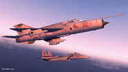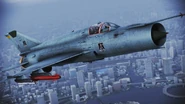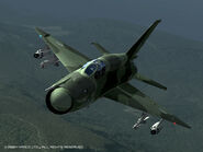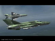 - 『An old Soviet Union fighter created in the pursuit of smaller size, lighter weight and lower costs. While it is old, with dubious electrical equipment and weapon carrying capabilities, its light weight provides excellent speed capabilities. However, due to low stability when rolling, it takes a while to become accustomed to handling it. Known by the NATO codename of "Fishbed", more than 10,000 were produced (including variants) and distributed to the countries of the old Eastern Bloc, making it an extremely well selling fighter.』